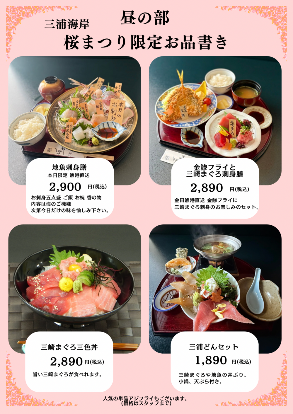三浦海岸桜まつり期間中(昼の部)メニューとなります。